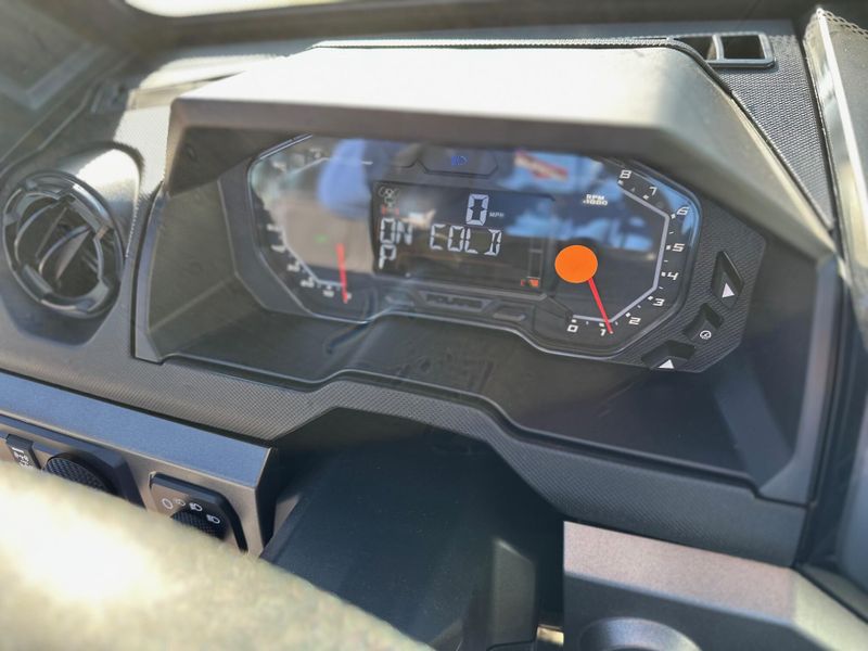 • Driver Instrumentation: Driver forward information center with 4" color display and analog speedometer and tachometers: user-selectable blue/red backlighting and brightness, speedometer, tachometer, odometer, tripmeter, clock, hour meter, gear indicator, fuel gauge, coolant temperature, oil pressure, transmission indicator, EPS indicator, voltmeter, service indicator and codes, seat belt reminder